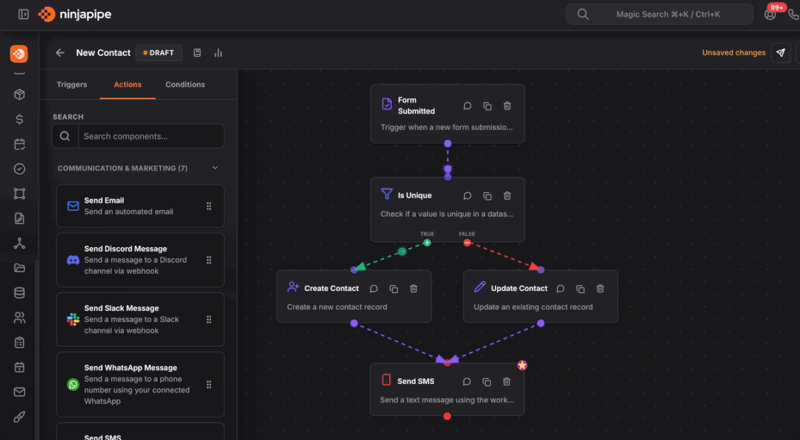 Visual canvas: drag steps, connect lines, split when you need “if / else”
