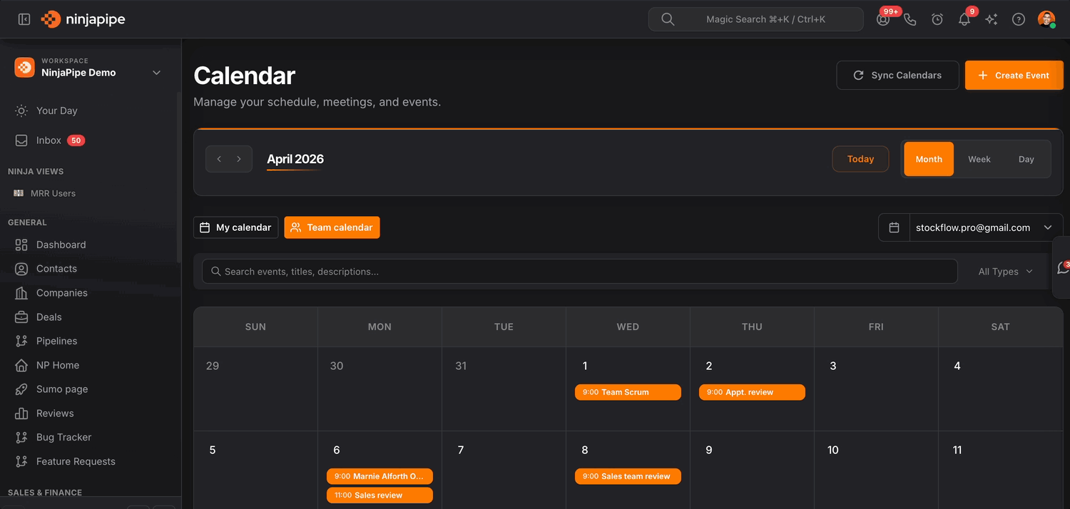 Toggle your schedule versus the team’s, search and slice what matters, and drag events when plans change, without losing weekends, all-day blocks, or the details that close deals.