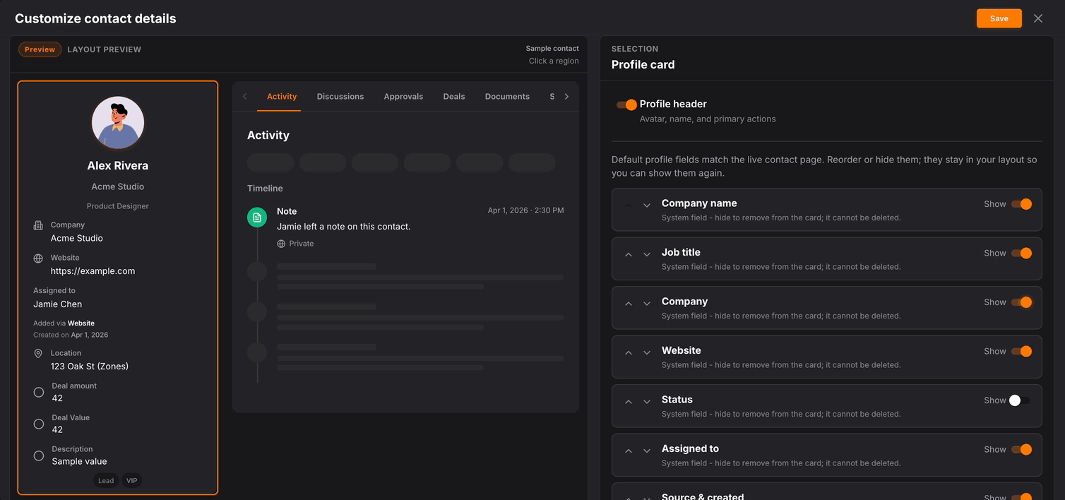 Work the list with sortable columns, saved views, assignee and field filters synced to the URL, duplicate detection, and imports, then open any person for a configurable profile with activity, conversations, documents, commerce links, and automations scoped to contacts.