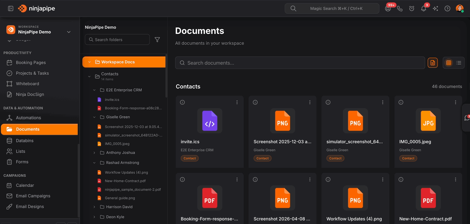 NinjaPipe aggregates files from contacts, deals, products, budgets, and more, normalized into one list so reps stop guessing which record hid the MSA or the latest deck.