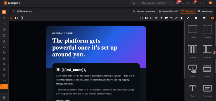 Use the full layout editor with newsletter-ready blocks when you want pixel control, or switch to simple mode for quick announcements, either path saves clean HTML and supports merge parameters for personalization.