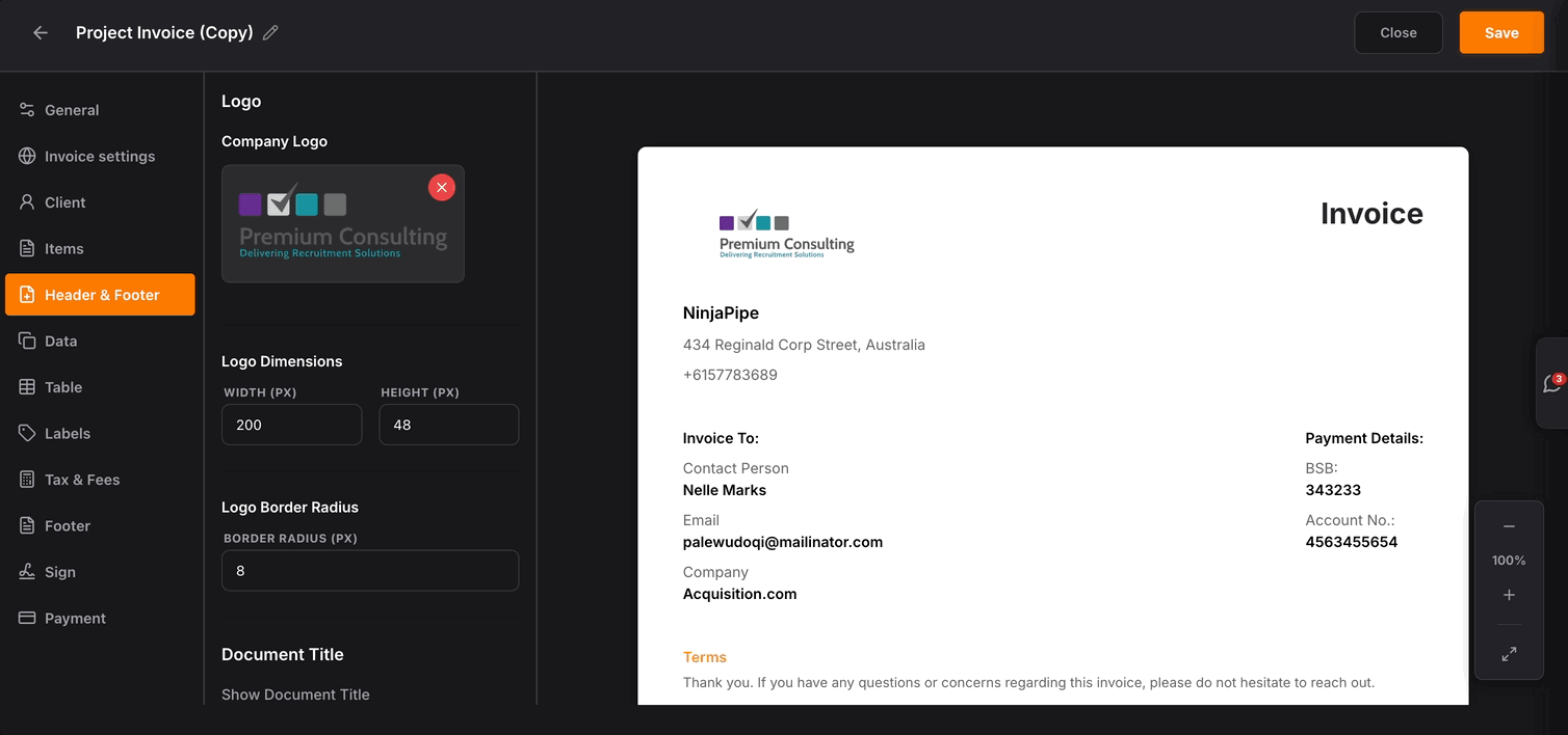 Build branded invoices in a full visual designer, line items, taxes, and table layouts, then track every document from draft to paid, share a public page, and take Stripe or PayPal without a separate billing stack.