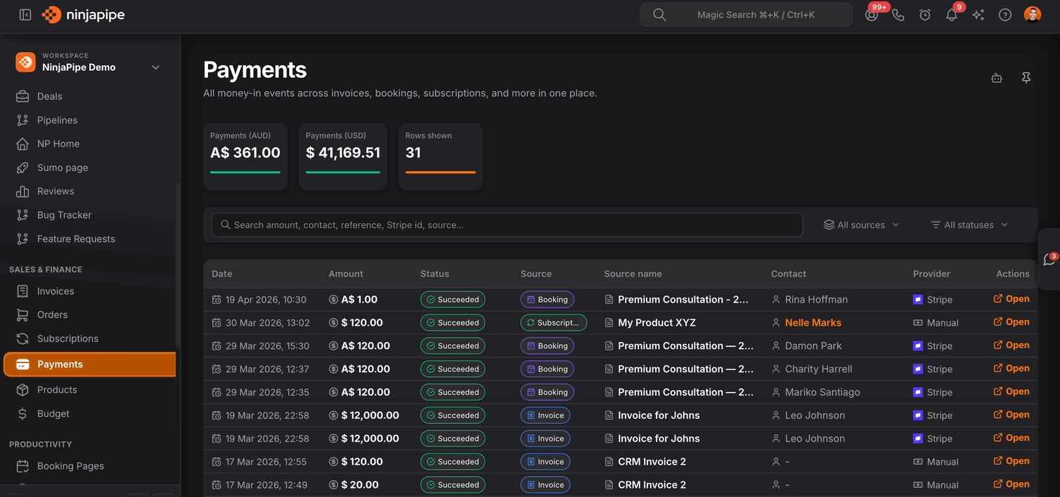 Workspace payments pull from the places money actually moves: paid invoices, booking pages, recurring contact subscriptions, and orders, each row carries a source label and a deep link when you need the full story.