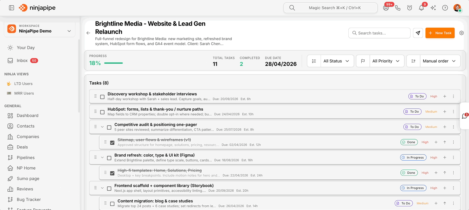 NinjaPipe connects client records, project tasks, and communication history. Creative, media, and account teams can align on deadlines and approvals with less Slack archaeology.